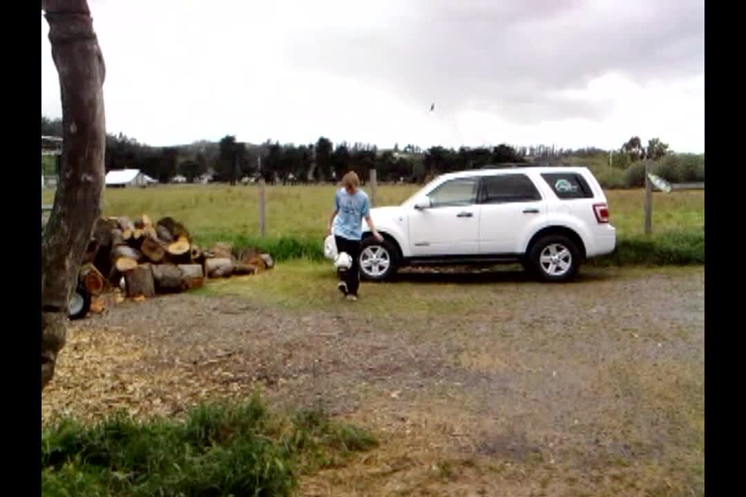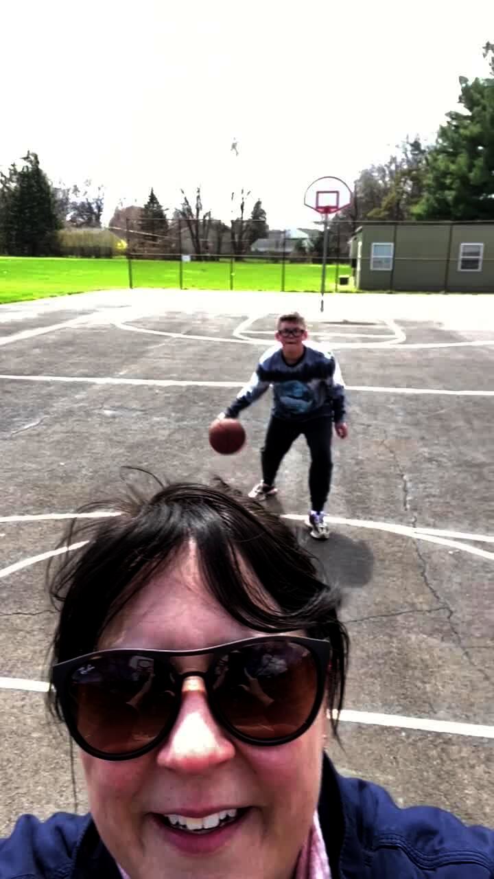 A young boy throws a basketball while a woman stands in front and films him at a park, and it hits her, then she drops the camera. Slow motion.