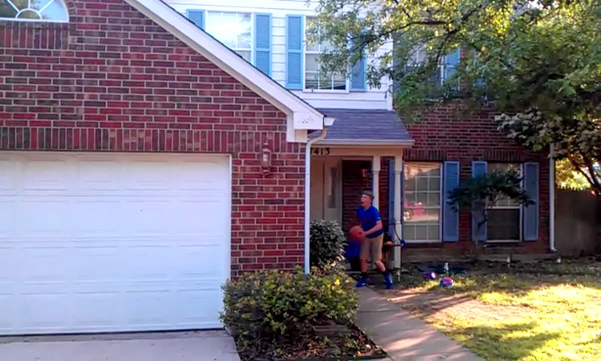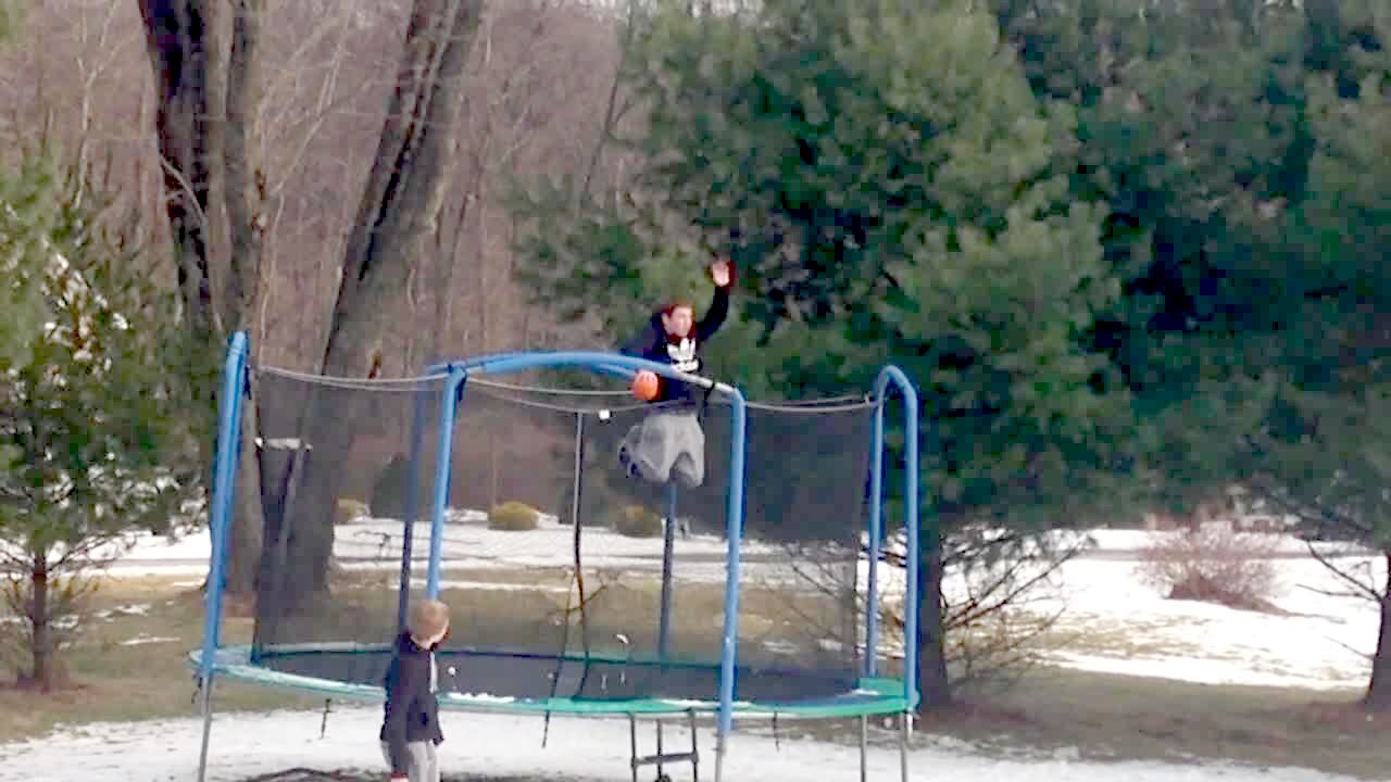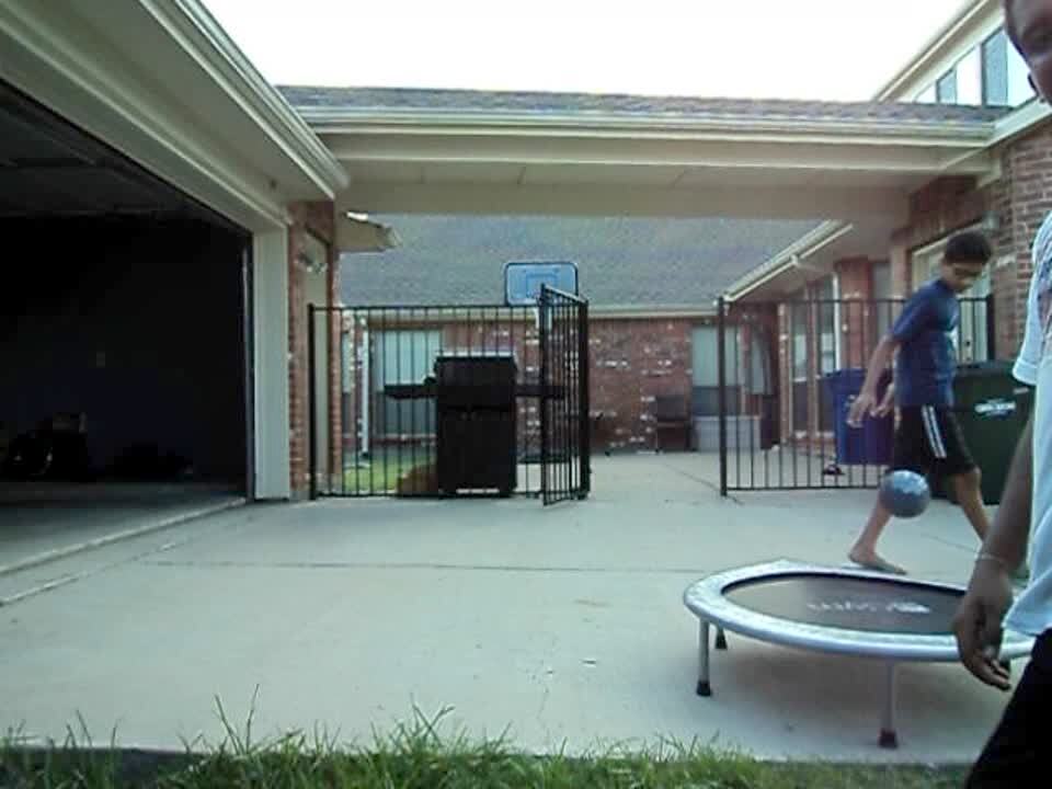 Boy holds a trampoline in the driveway, another boy bounces a basketball on it. The ball flies over his head & goes into the hoop far behind him in the backyard. Amazing shot.