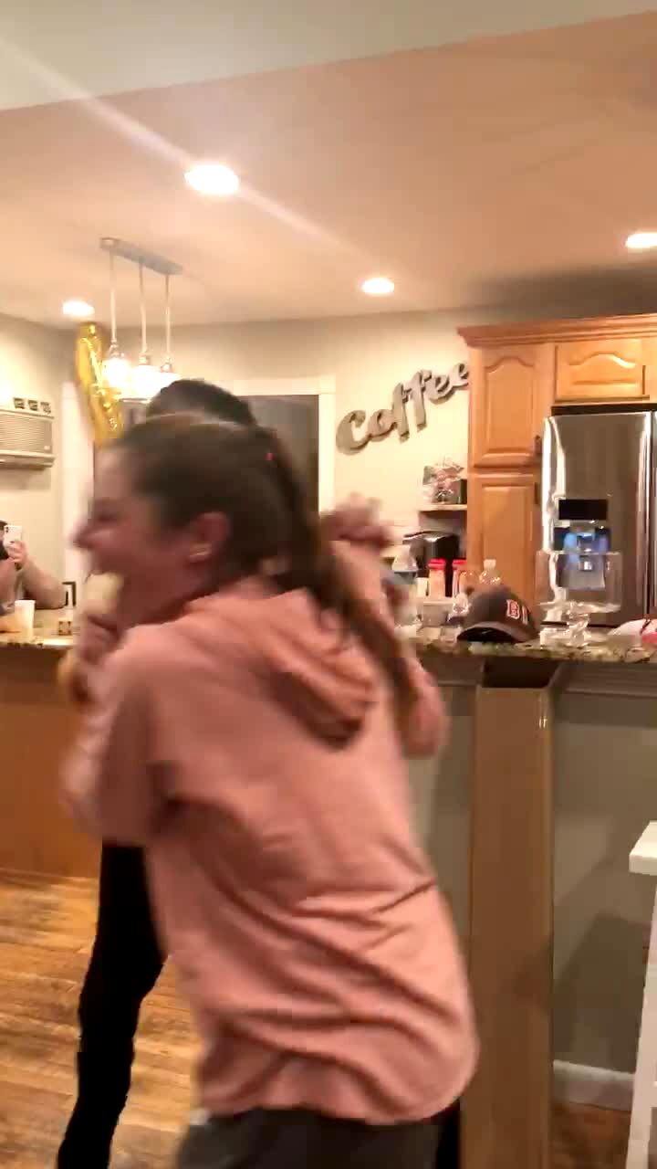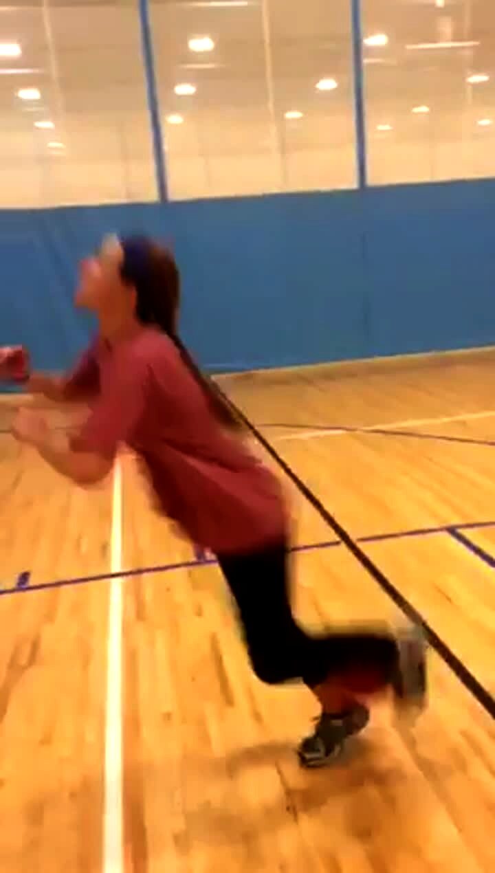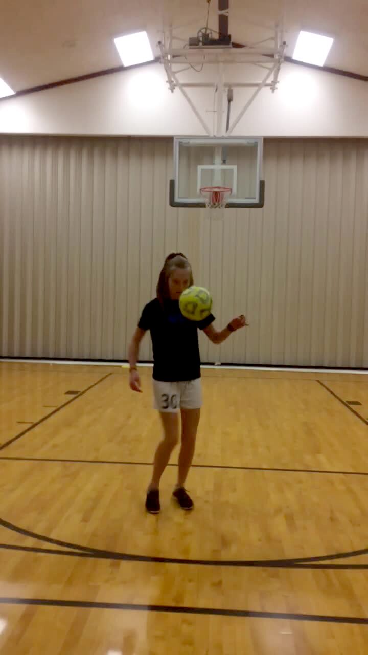 A man screams in a gymnasium when a teen girl kicks a soccer ball over her head and it goes in to a basketball hoop.