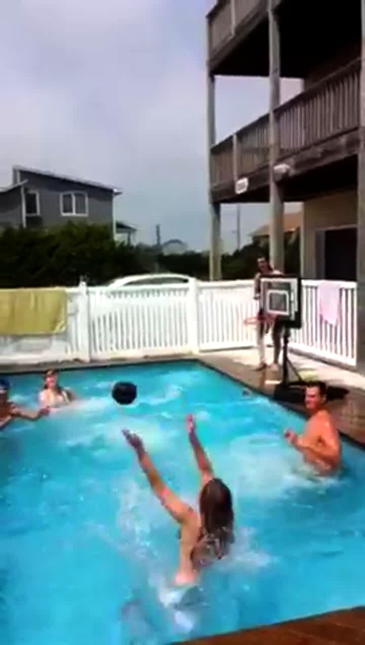 A group of teen boys and girls take turns handling a ball and passing it to each other before jumping into a pool and the last person shoots the ball into a hoop attached to the pool