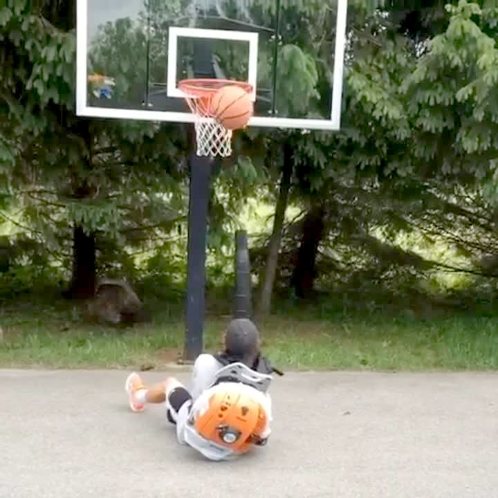 A teen boy uses a leaf blower to hold a basketball in the air before another teen boy grabs the ball and dunks it into a basketball hoop outdoors.