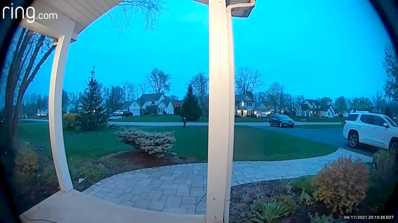 A woman says "hello" as she walks up to the front porch of a house, then she walks into a glass door. Security footage.