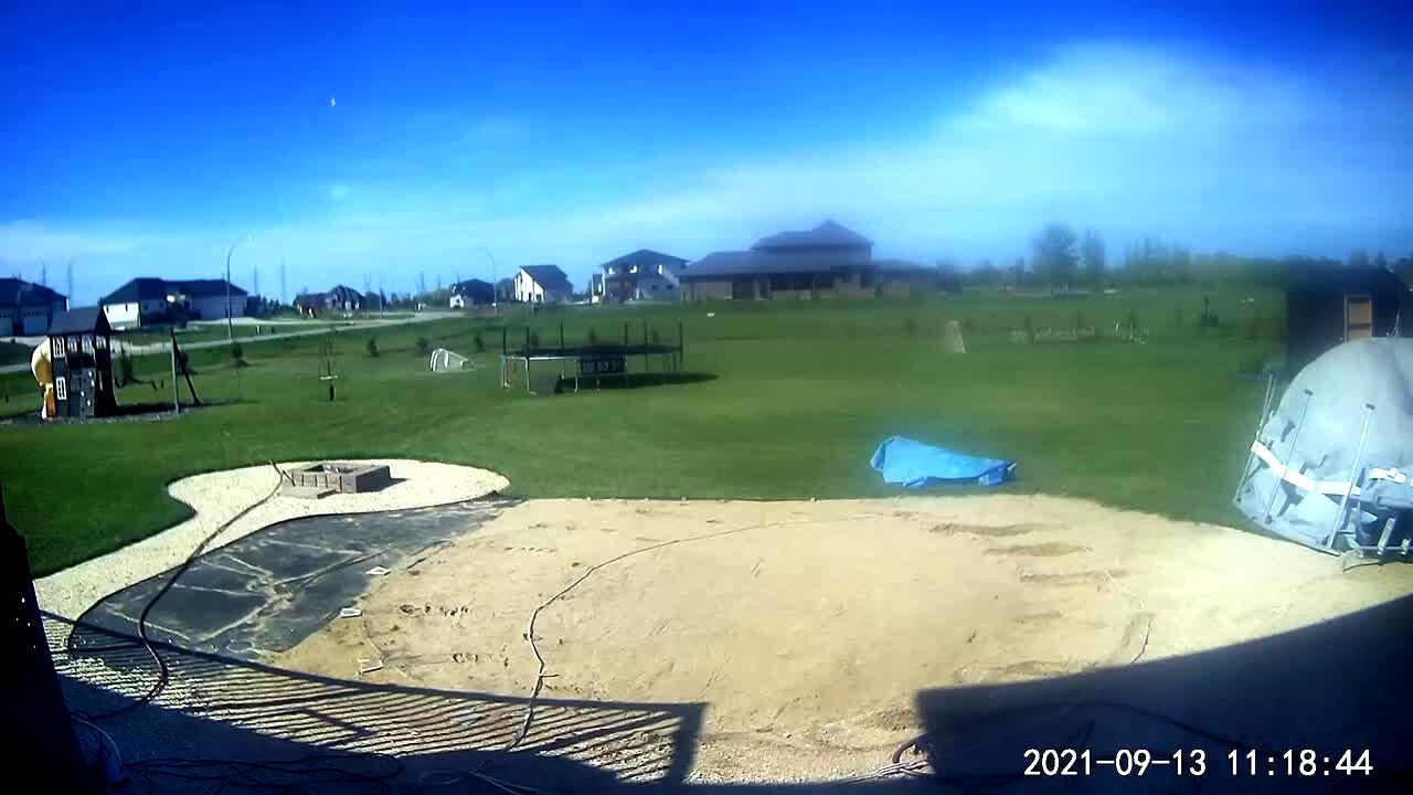 A young girl drives her mom's golf cart around in a driveway when a bag of feed falls onto the gas pedal as she goes in circles and screams for her mom to help her then crashes into some logs. Security footage.