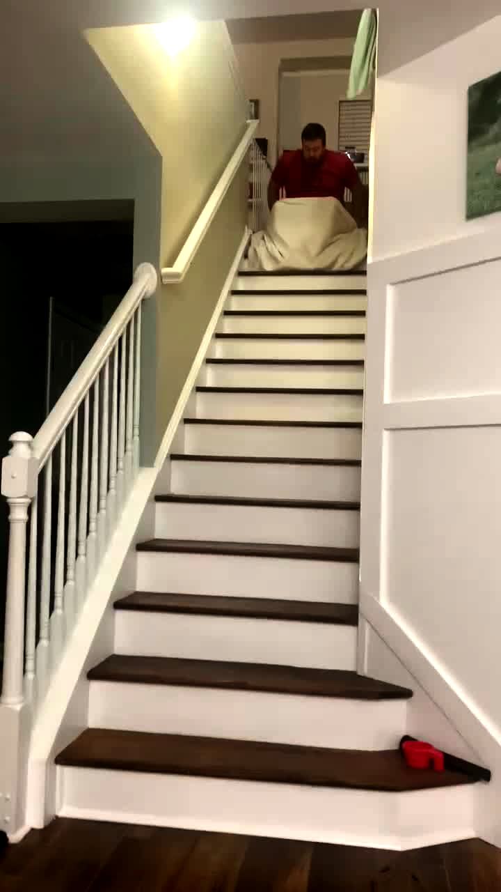 A man sits on a cushion and a blanket and sleds down a staircase. A dog follows him down. The man hurts his bottom.