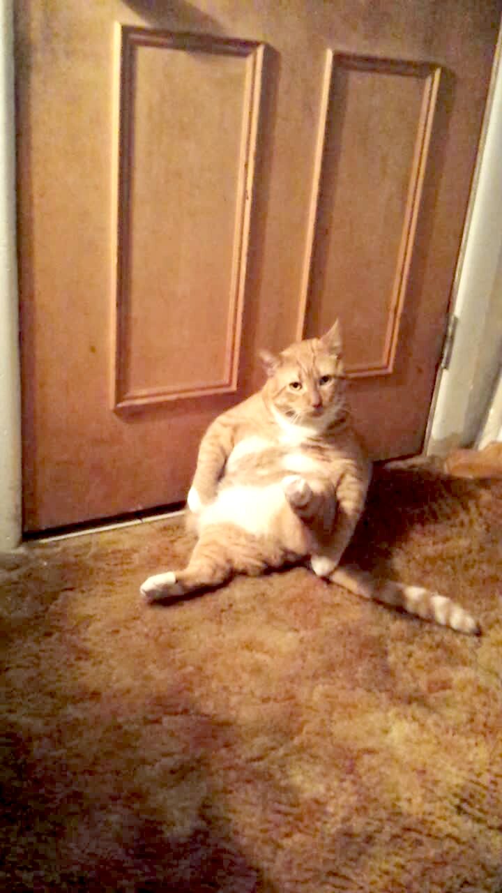A fluffy cat sits upright on the floor like a human and casually wags his tail indoors.