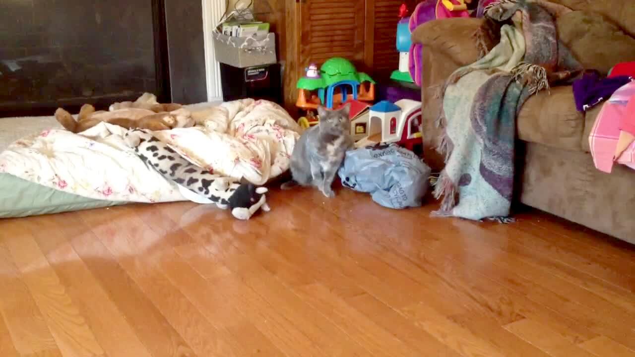 A cat plays with a bag in the living room and freaks out when it gets stuck to it. Action at :12.