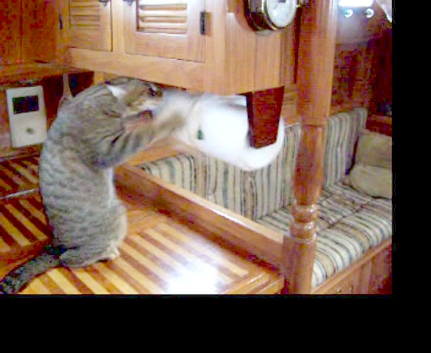 In the kitchen, a cat's tail hangs underneath a stuffed sheep, looks like a penis moving around. .