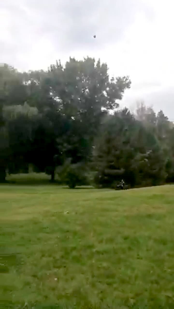 Teen boy does somersaults down hill, gets hit in head with football (would look good in reverse).