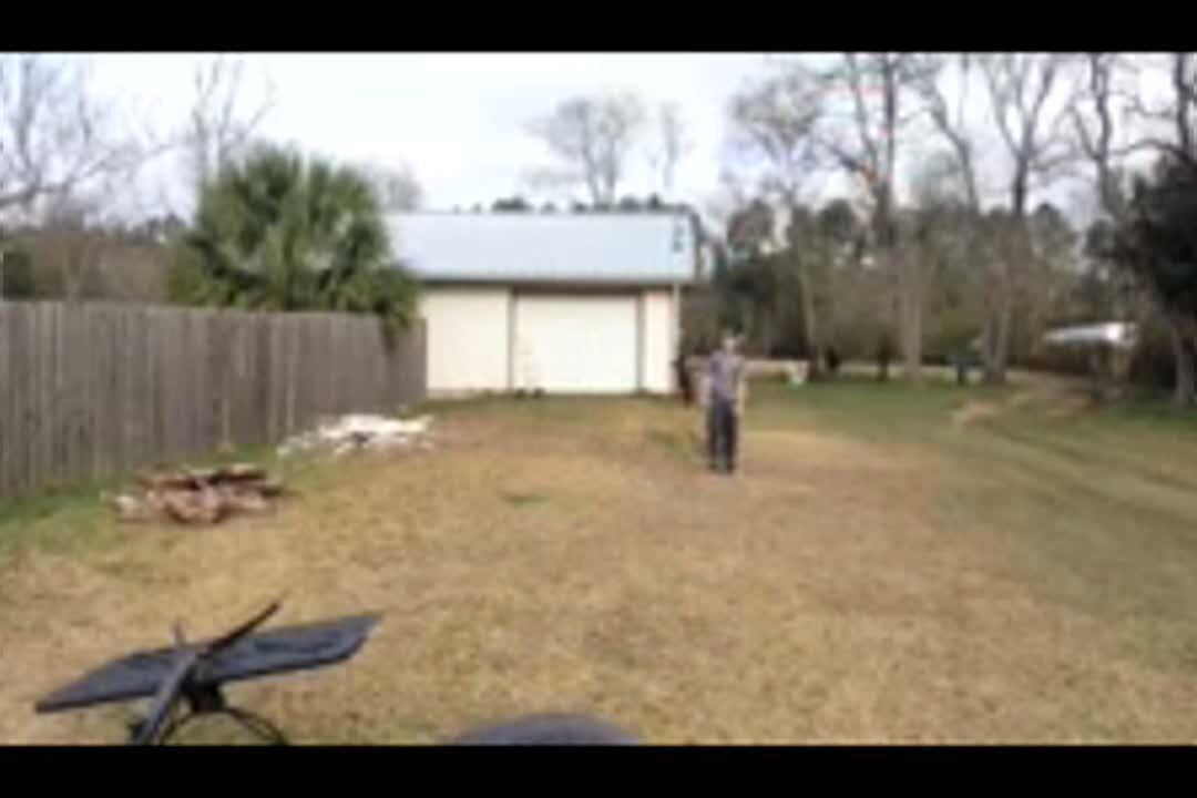 Teen boy kicks a football & another teen runs into a tree trying to catch it. Hit is hard to see behind patio / porch.