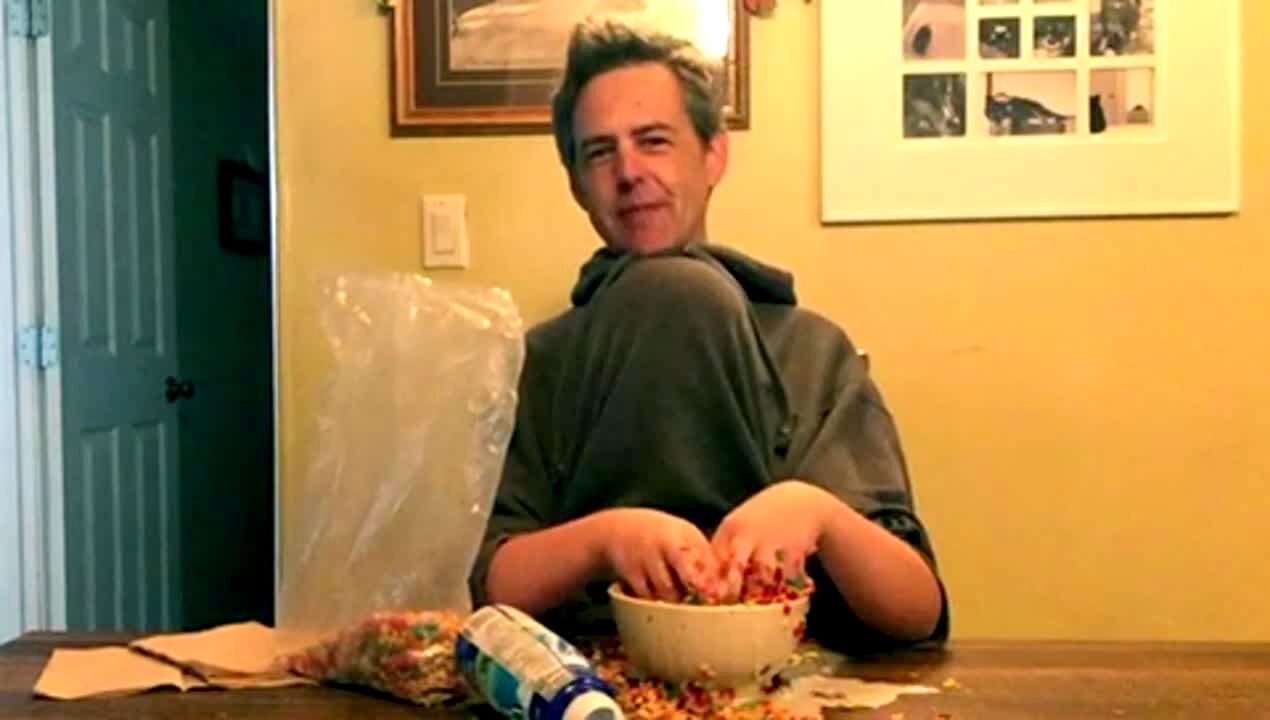 A man and a young boy do the Borrowed Hands Challenge and eat cereal with milk and rub cereal all over the man's face.