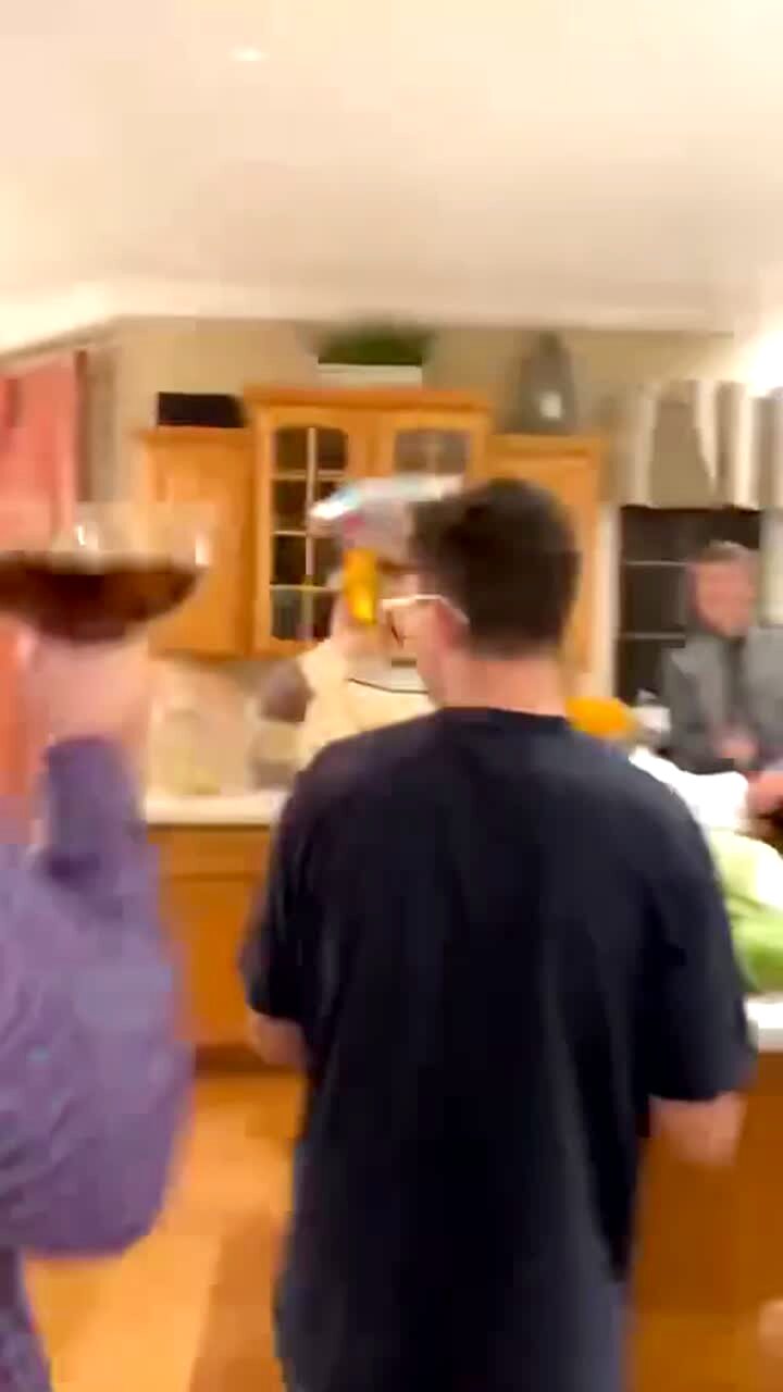 A teen boy sings "Macho Macho Man" as he carries a large drink into a kitchen. He places it on the counter, then climbs up onto the counter and knocks it over.