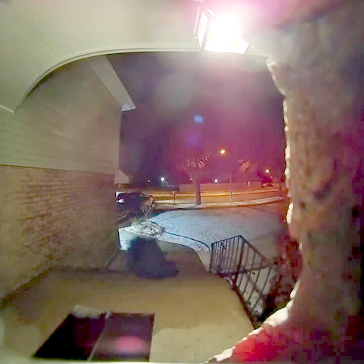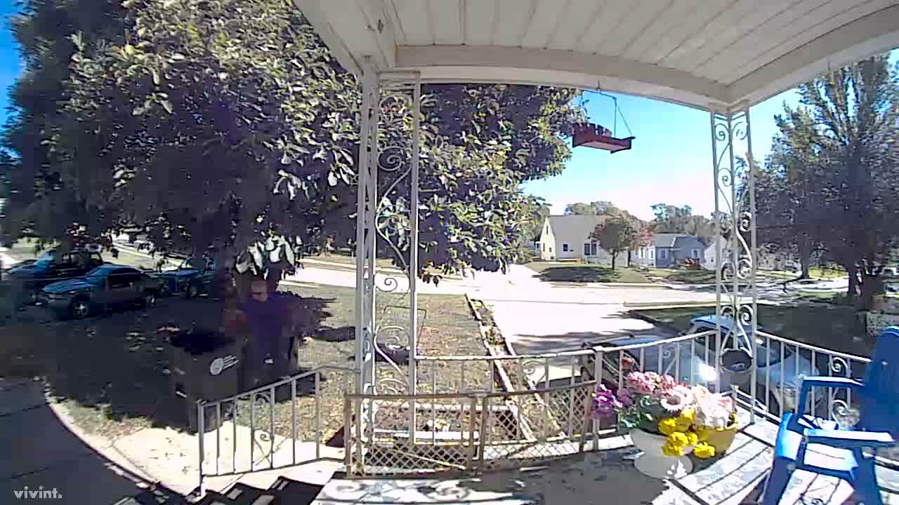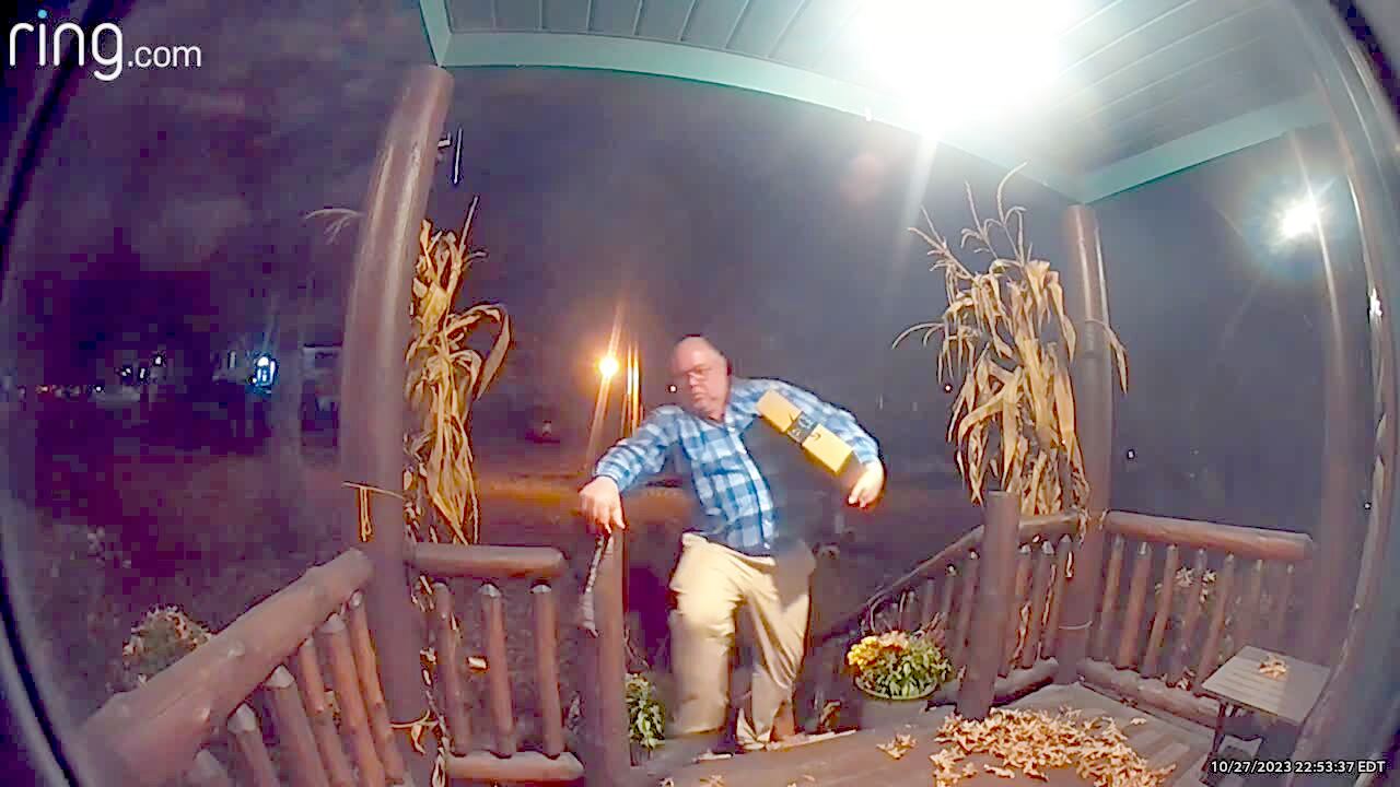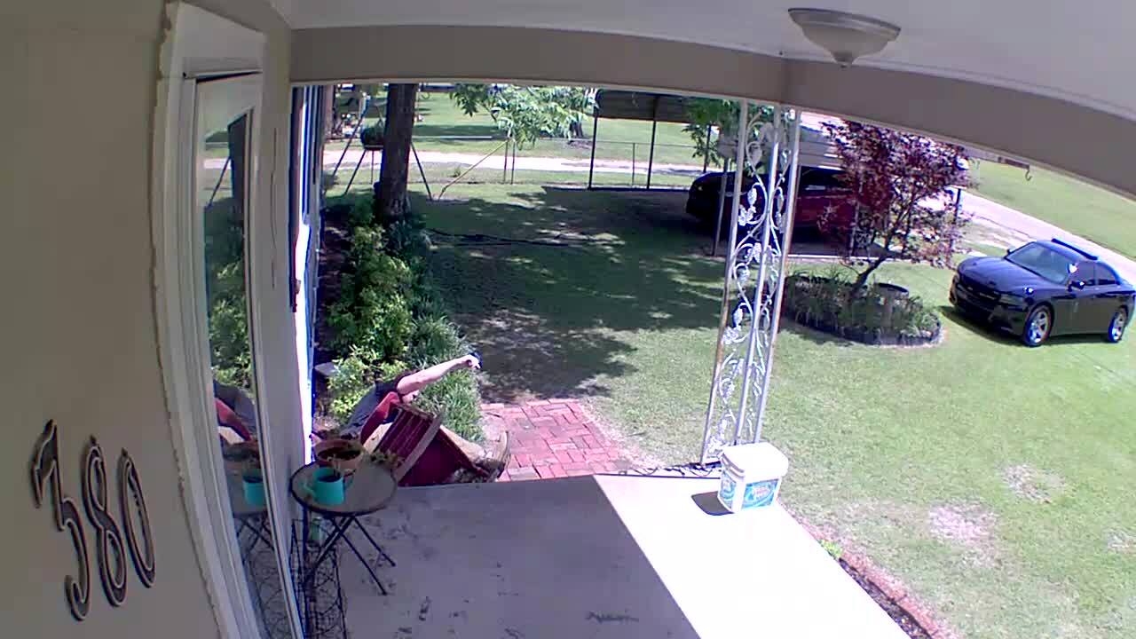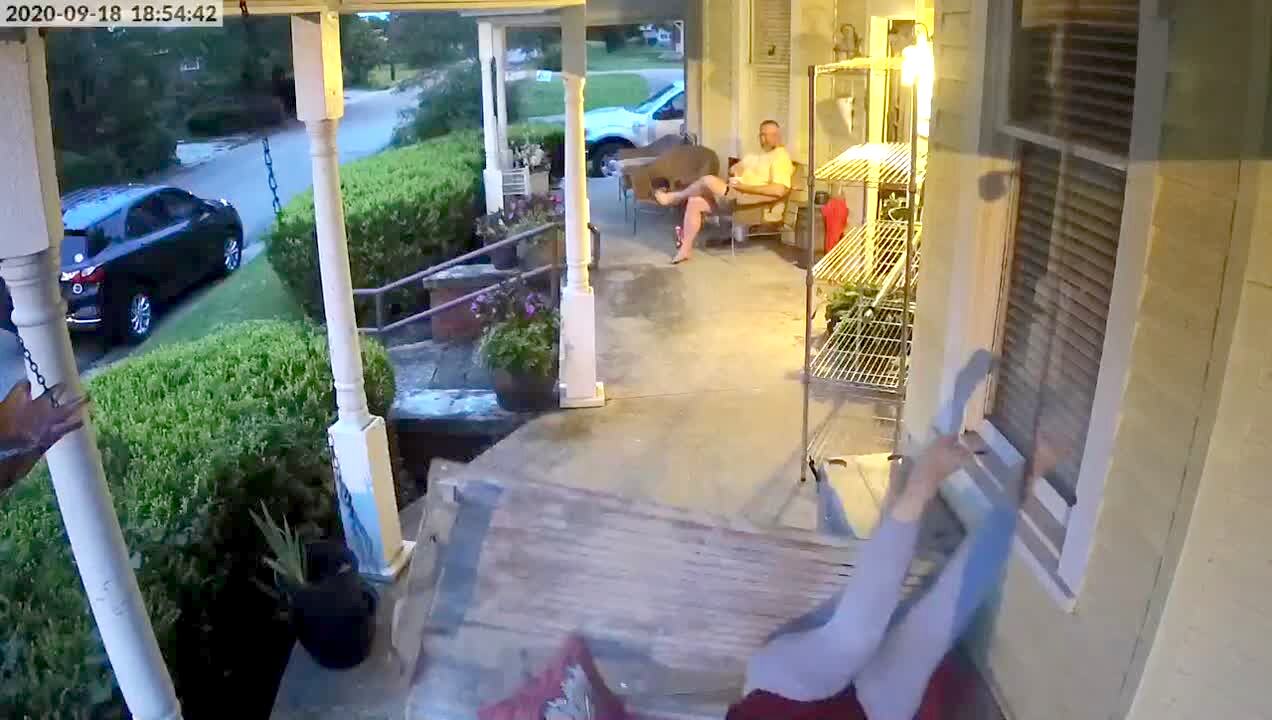 While on a phone call, a man topples off of a front porch in a rocking chair. Security footage.