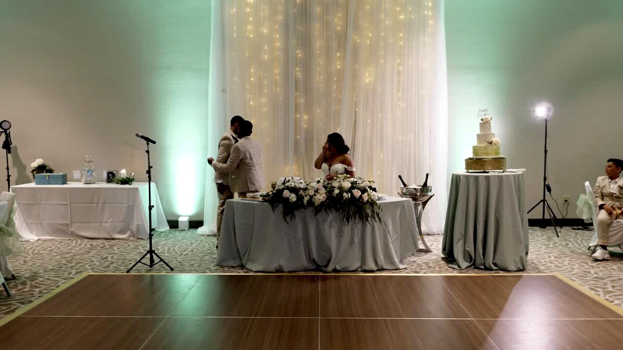 A man finishes a Best Man speech at a wedding, and as he hugs the bride and groom the backdrop falls on them and onto the cake. Reception.