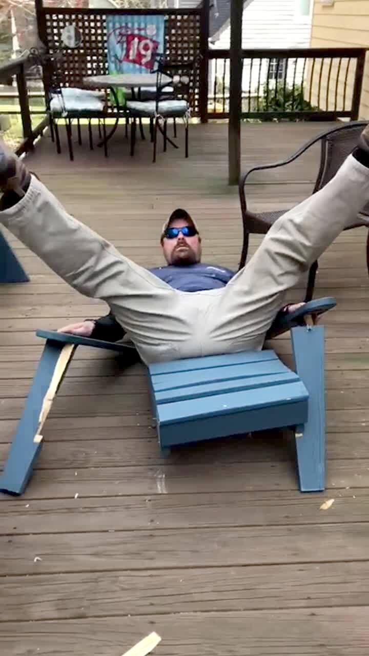 A man falls on the patio when a wooden deck chair breaks as he leans his back against it repeatedly while he sits down.