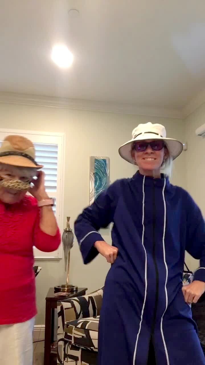 A senior woman and another woman record a video to wish a couple well for their wedding, but then one holds the other's leg up and the fall.