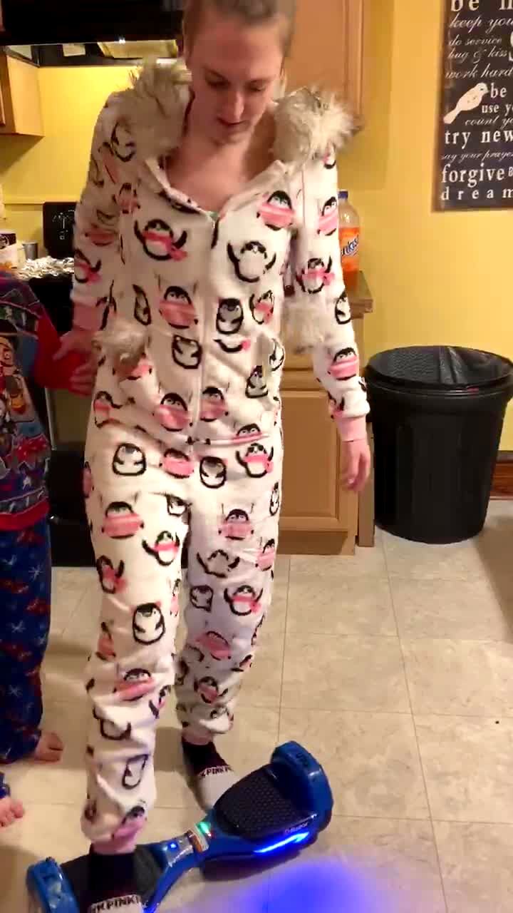 A teen girl gets onto a hoverboard in the kitchen as she holds onto her younger brother, but she loses her balance with her second foot and falls and drags the boy down with her.