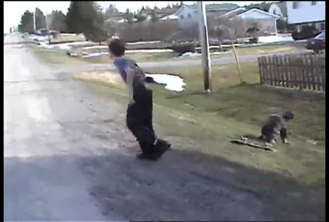 A young boy in his driveway tries to shoot a basketball but it comes down and hits him in the face. He falls.