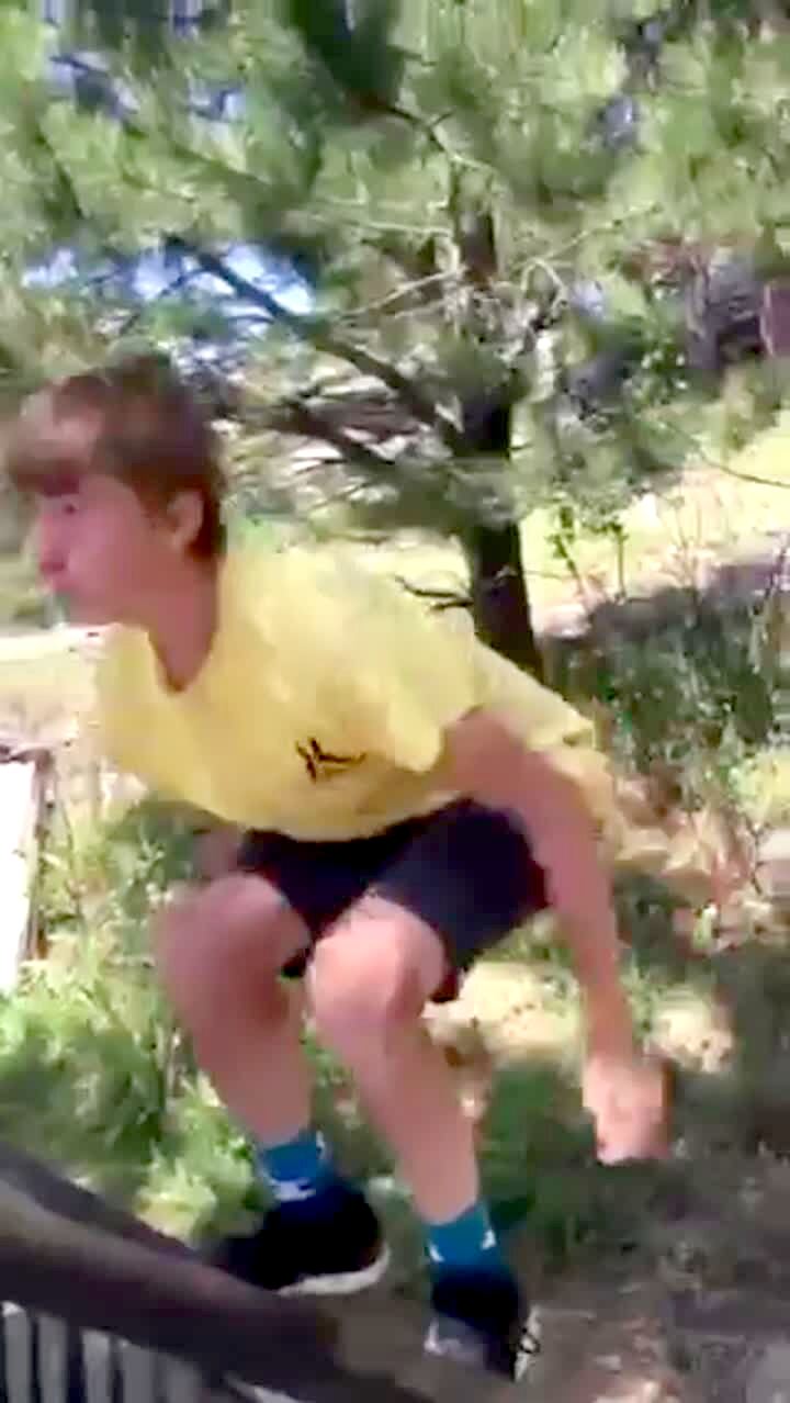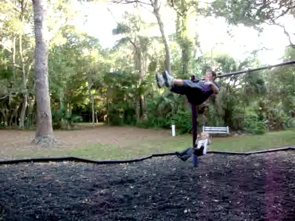 A young boy climbs onto a handrail in a park, does a backflip off of it, but hits his head hard on that same rail on the way down.