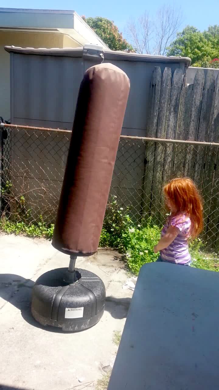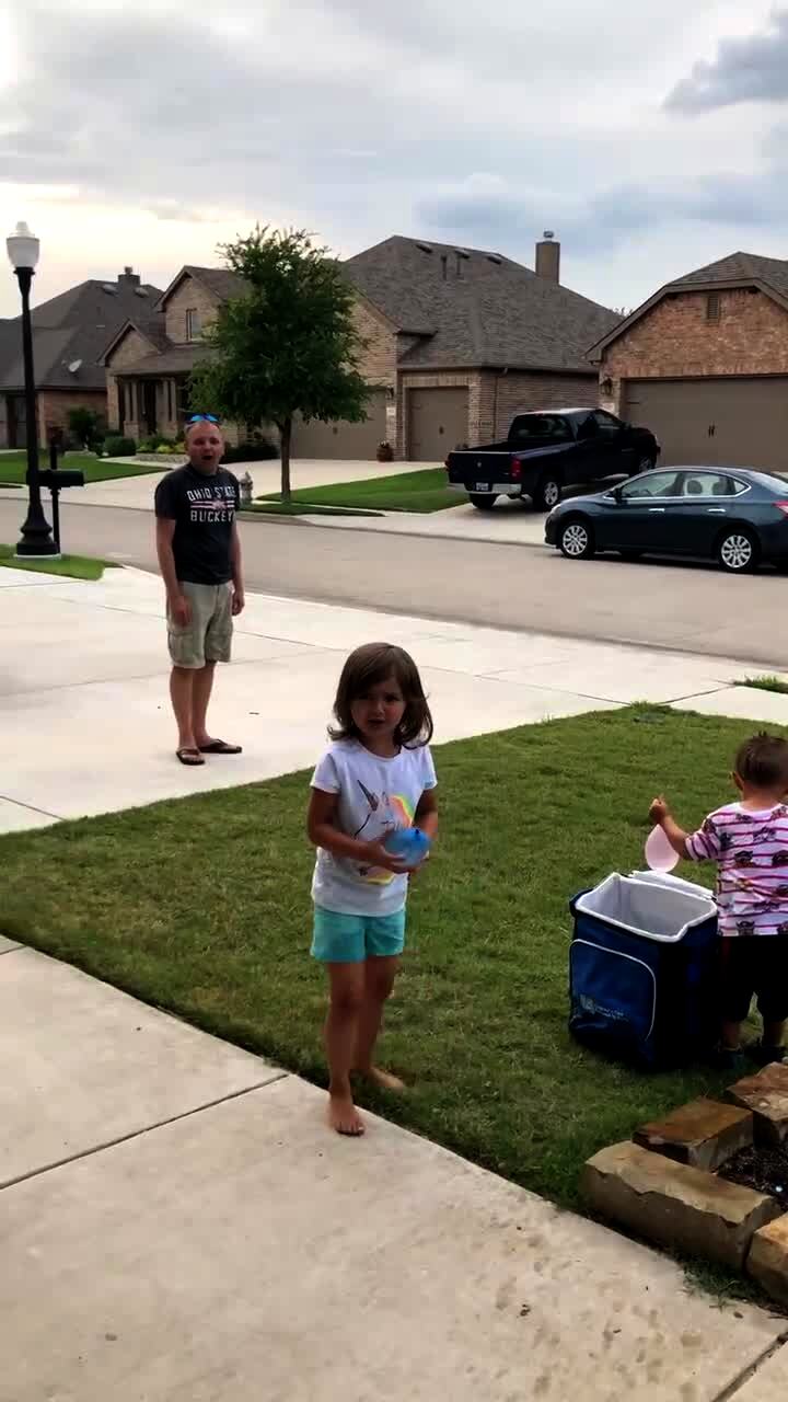A young girl hits a wiffleball that hits her father in the head while he sits in a lawn chair in the yard. It ricochets off his head and flies offscreen.