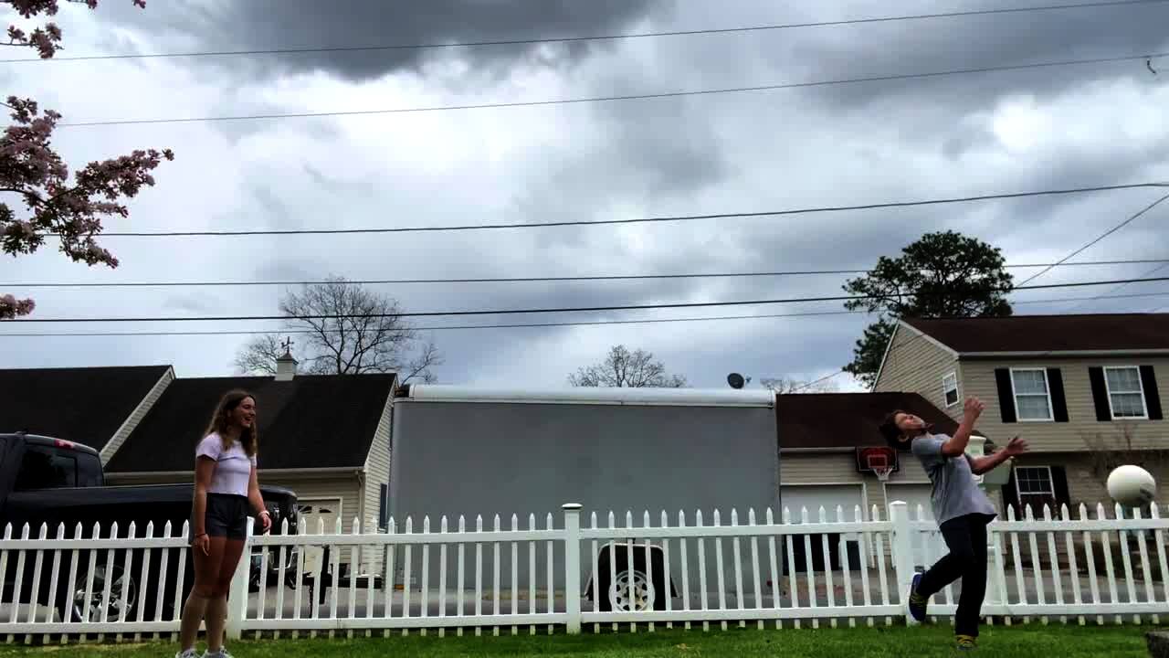 A teen girl and young boy bat around a volleyball outside in front of a white picket fence. The ball bounces off a rock and hits the boy in the face. The girl doubles over laughing as the boy falls to the ground holding his head.