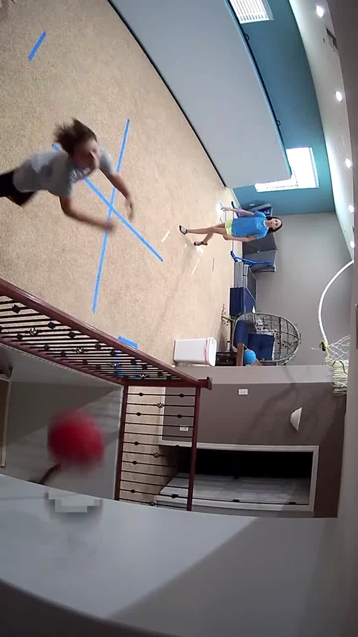 A young girl kicks a rubber ball which bounces off a wall and hits a boy in the face causing him to fall down. Video displayed sideways. Security footage.