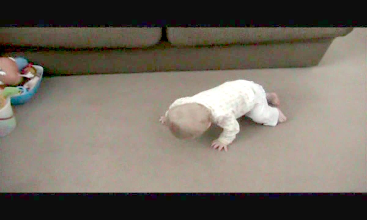 Tot girl wearing pajamas crawls across the living room floor, leans down to pick up a piece of cereal with her mouth and it sticks to her forehead.