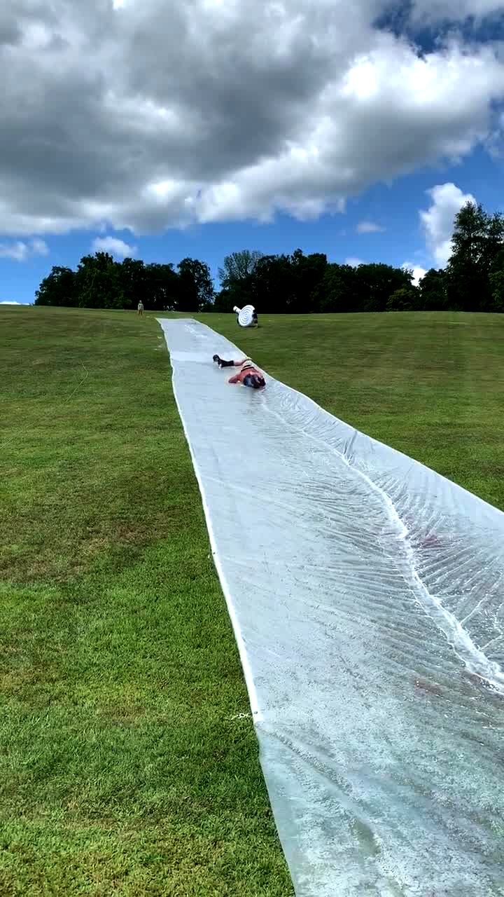 A dad slides down a backyard slip and slide quickly and stands up but falls backwards onto the ground and a woman laughs.