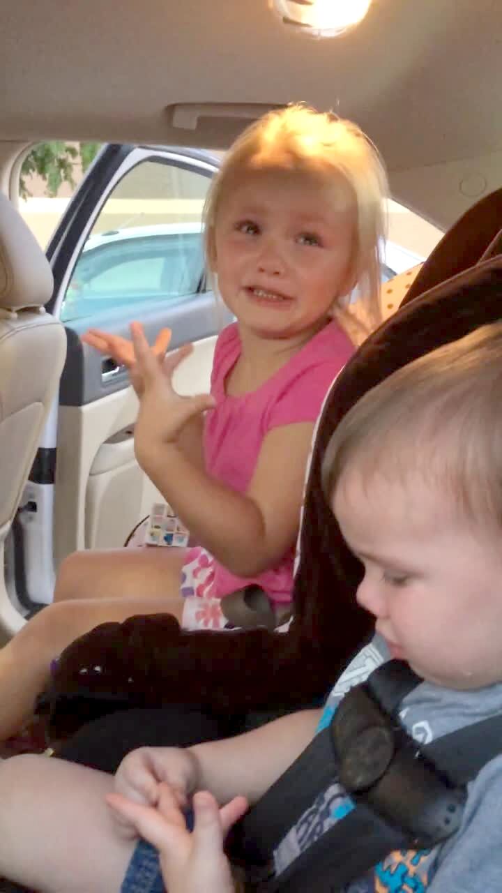 A young boy cries in his car seat, and his visibly frustrated older sister yells "I want peace and quiet!"