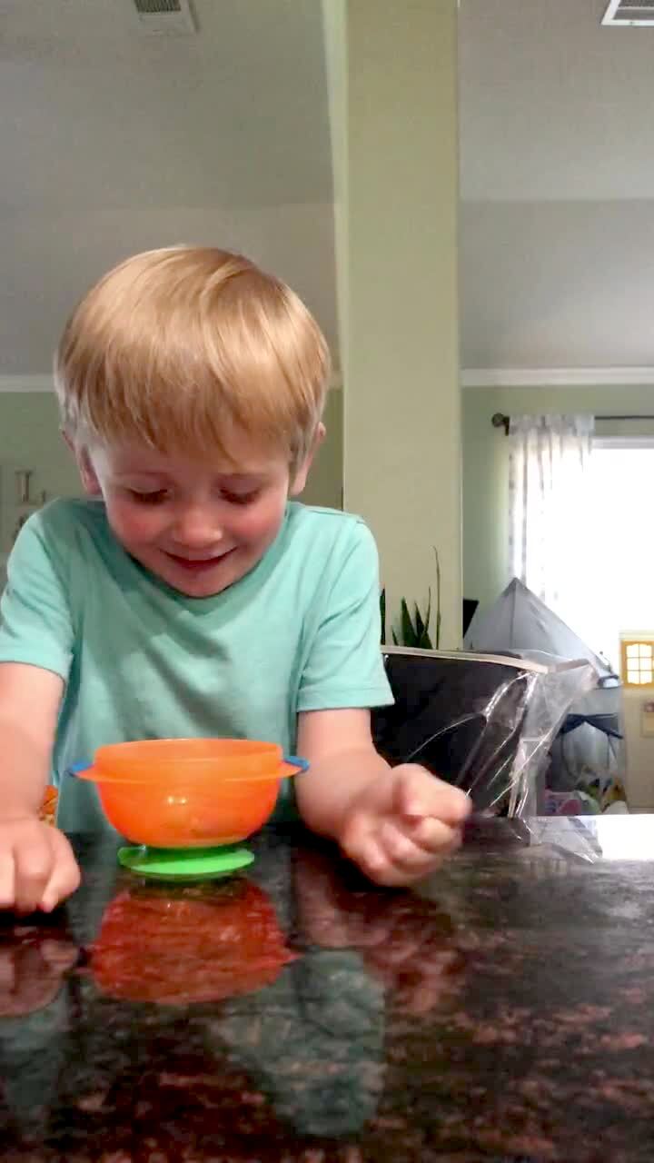 A woman puts candy in front of her son for the toddler temptation challenge in the kitchen and then walks away. The boy smiles and repeatedly says Ooh, Candy. He picks the bowl up and rubs his face in it. He smells and licks the pieces of candy, but does not eat them. His mom come back and lets him eat the candy.