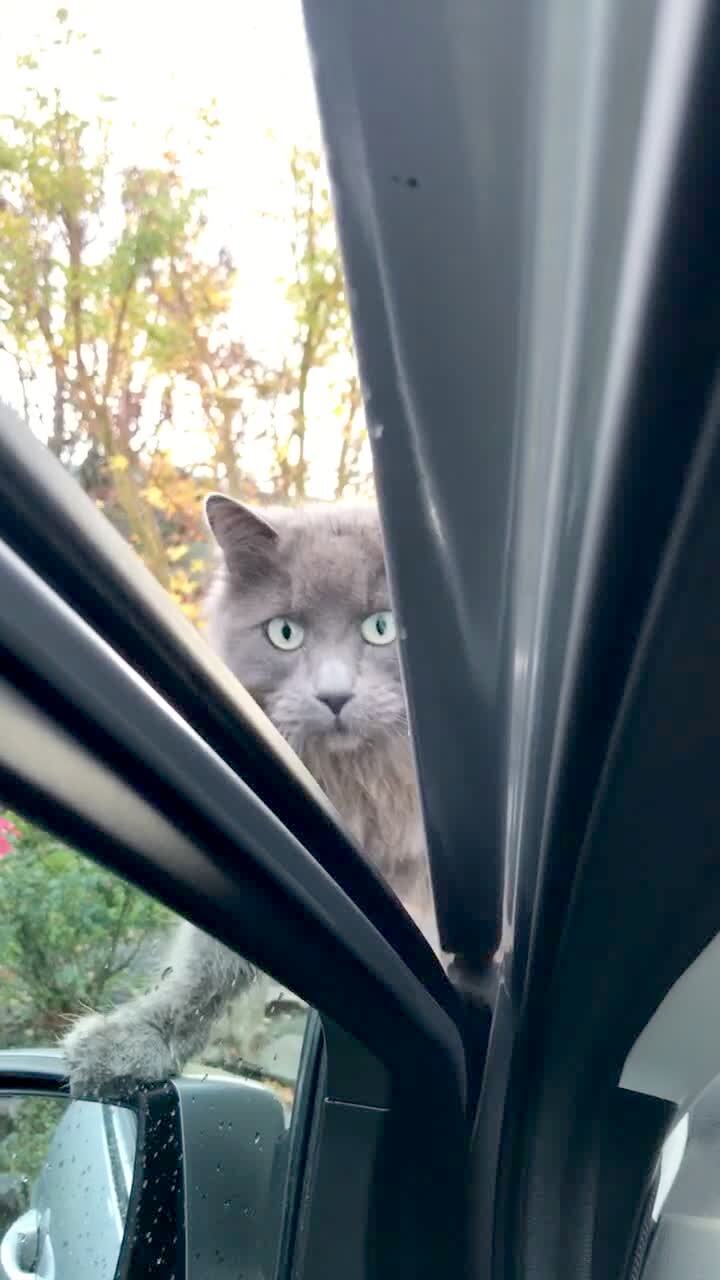 An adult man asks his car if its favorite movie is The Exorcist and the cats eyes go wide and he makes a weird noise with his tongue indoors.