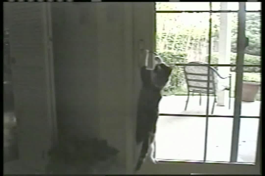 A cat jumps from a trash can to a screen door to open the door and let himself and another cat outside.