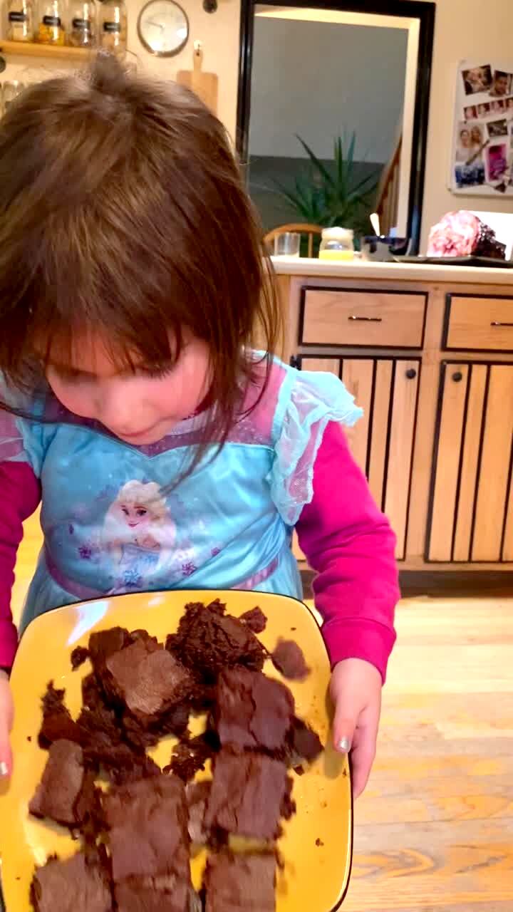 A young girl vlogs with a plate of brownies and says "look what I made" in a kitchen, but she tilts the plate and makes them all spill onto the floor.