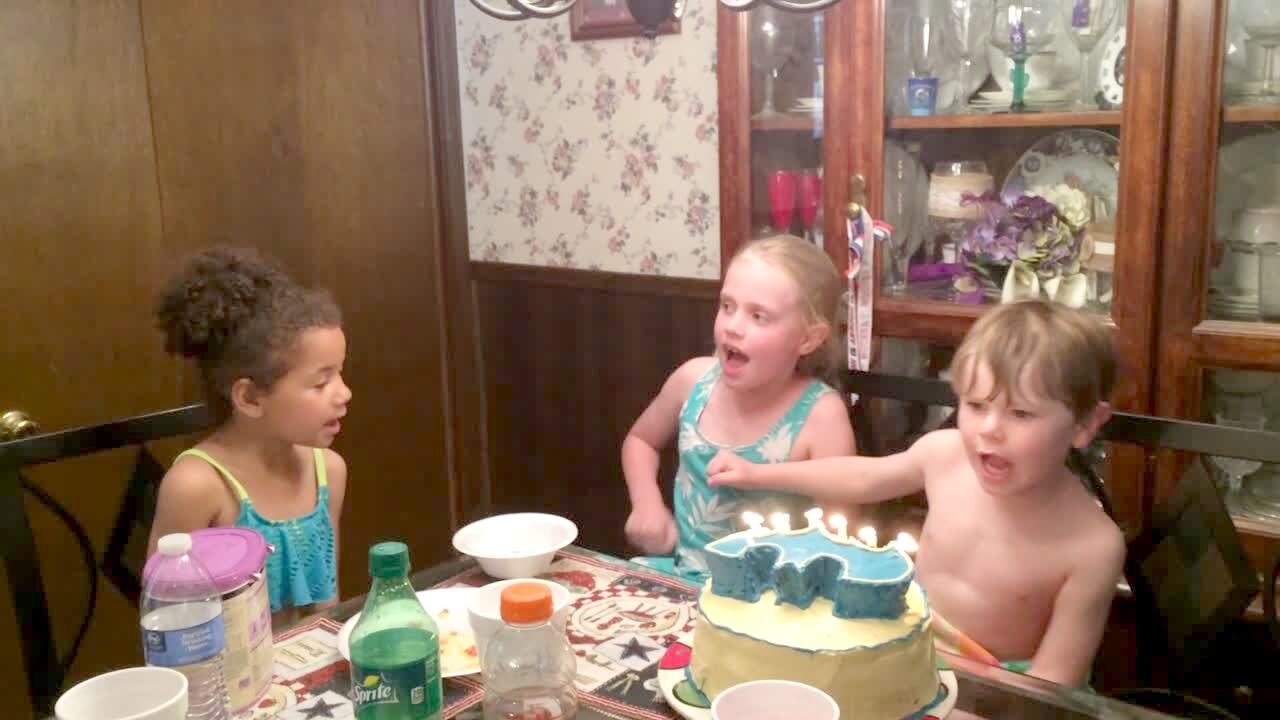 A young girl blows out her younger sister's birthday candles. One of the girls yells "IT'S NOT YOUR BIRTHDAY!"