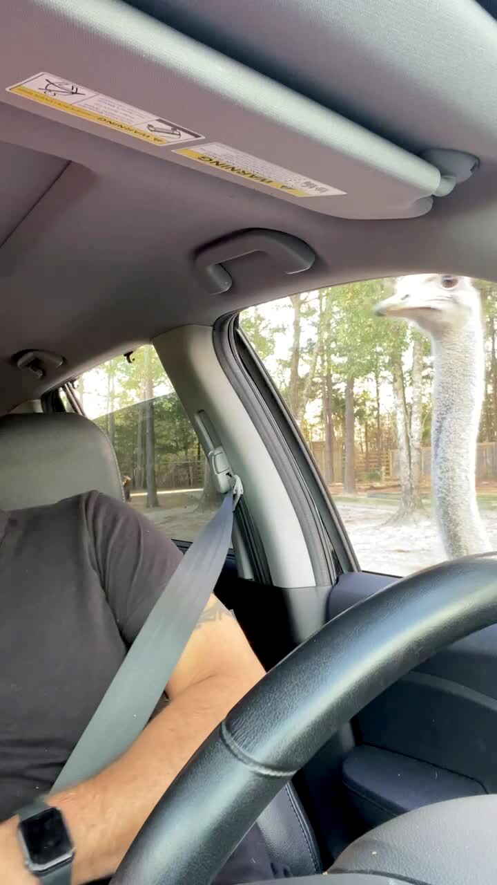 A man tries to show a tot boy how to blow a whistle. The boy puts the whistle in his mouth and voices a high pitched tone in the backseat of the car.