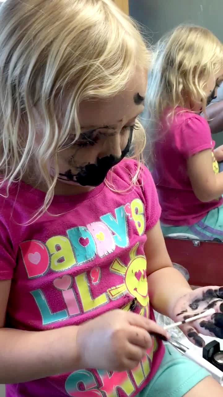 A tot girl sits on the bathroom counter with eye liner all over her face and says "Does it say: Am I in trouble?" when her mother asks her if she knows what it says on her shirt.