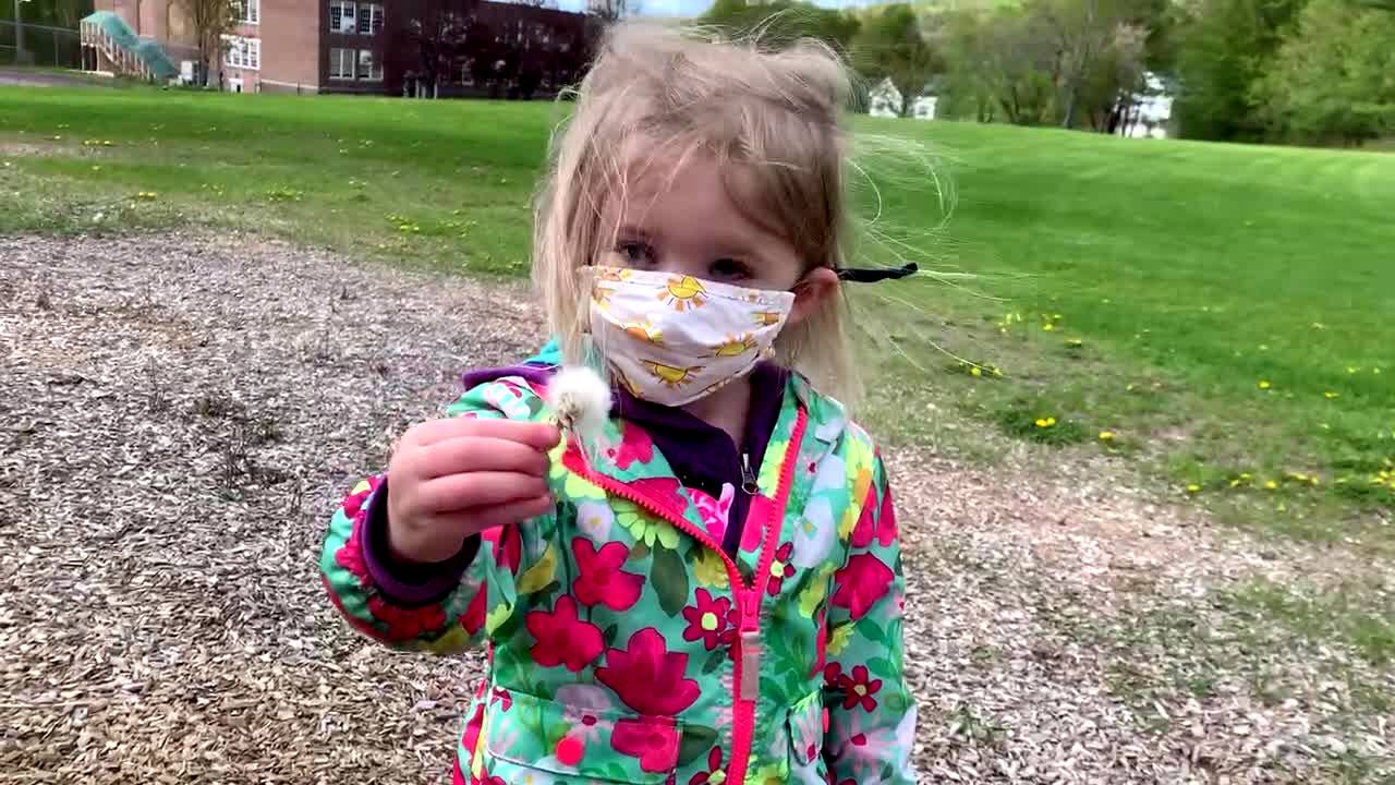 A tot girl brings a beach towel to her mother in the living room after her young sister drops the towel and runs behind a wall as she does the What the Fluff challenge.