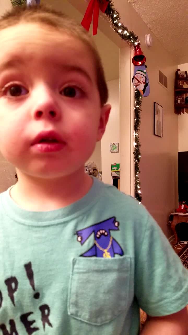 A woman in a living room reads a furniture tag that says it cannot be removed except by the customer, then a tot boy says that he thinks they will "go to jail and get the virus" because they took the tag off of the furniture.