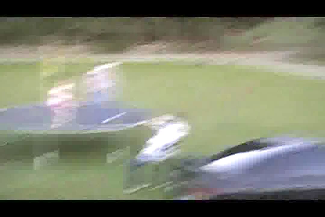 A woman leans on a railing and falls into the yard when it breaks. Then a dog pees on her. Security footage.