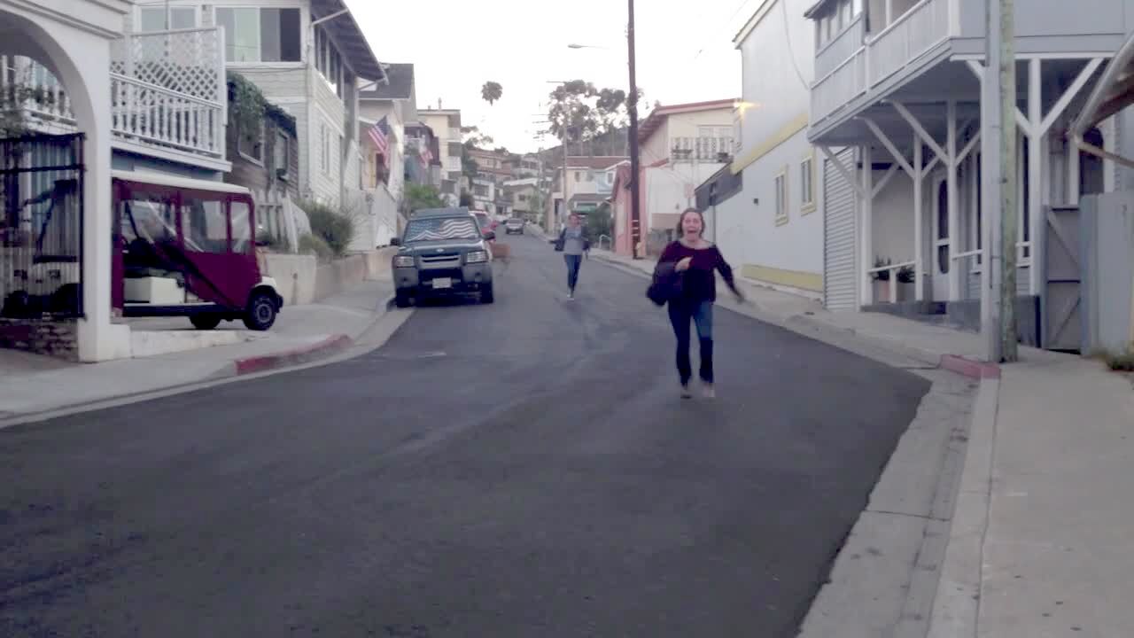 "D'oh a Deer!" Three women run down a street/ hill and scream when three deer pop out next to them at :07 and run down the hill.