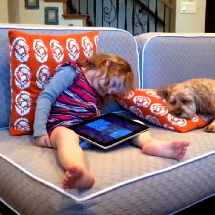 "The Napper and the Yapper" A tot girl falls asleep with an iPad on her lap while sitting up on a couch indoors. A small dog barks next to her and wakes her up.