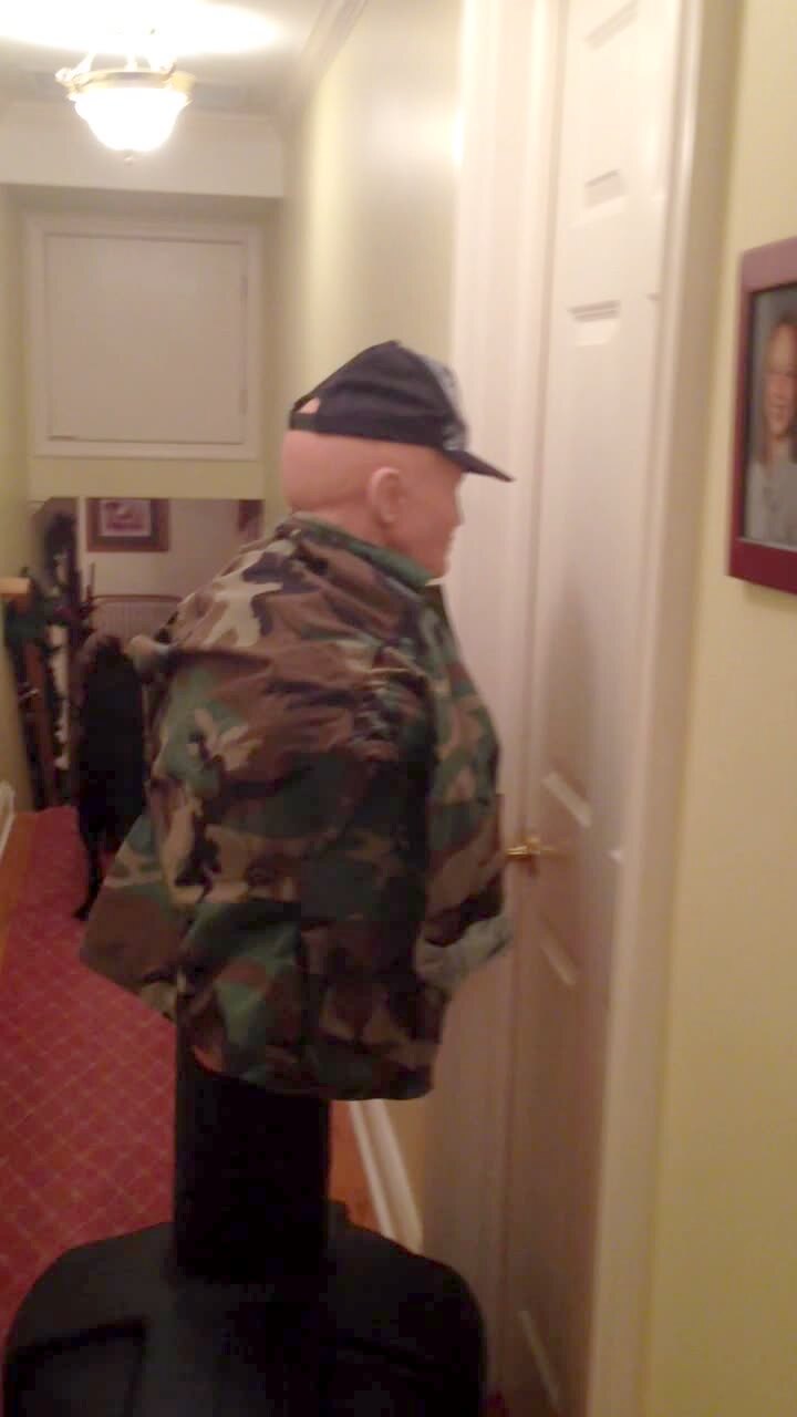 A man knocks on his teen daughter's bedroom door with a punching bag dummy in a coat and hat sitting in the hall. She opens the door, it scares her, and she pushes it over. Practical jokes.