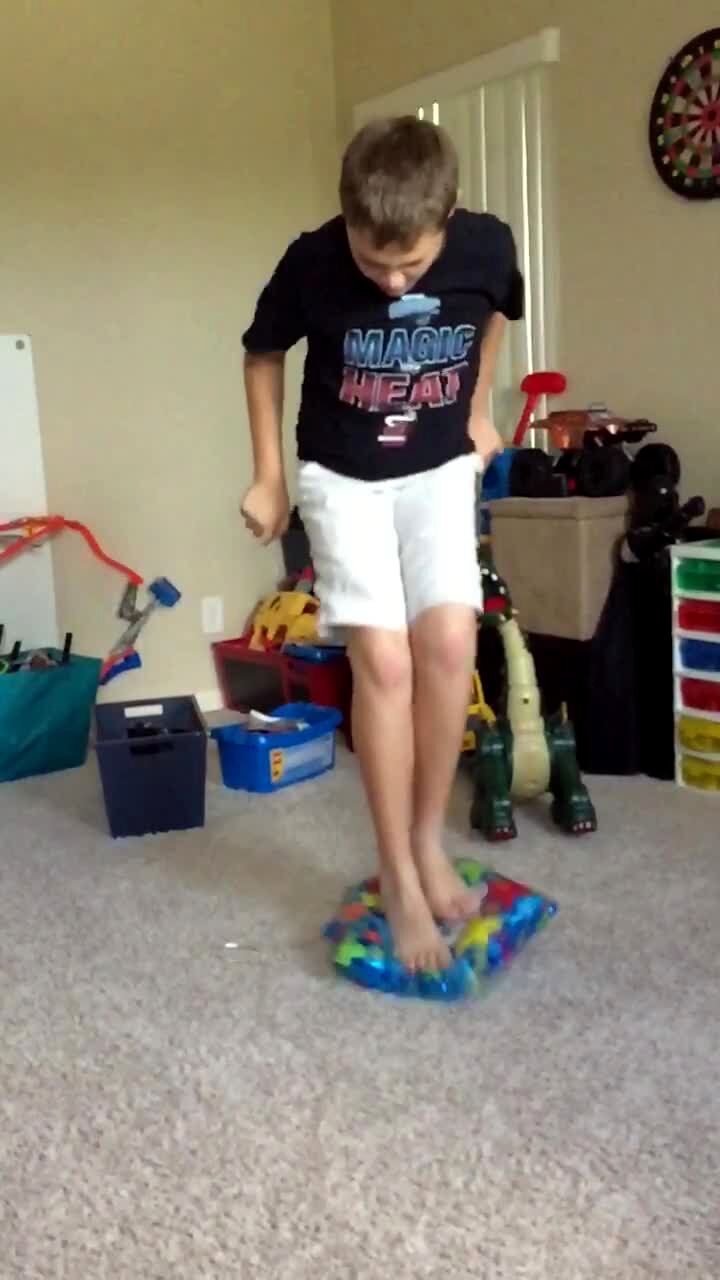 A tot boy jumps on a pump for a toy rocket launcher in the living room and the rocket shoots out and hits him in the face.