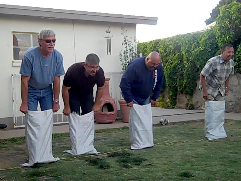 Four men have a potato sack race in backyard. Two of them bump into each other hard and fall down.