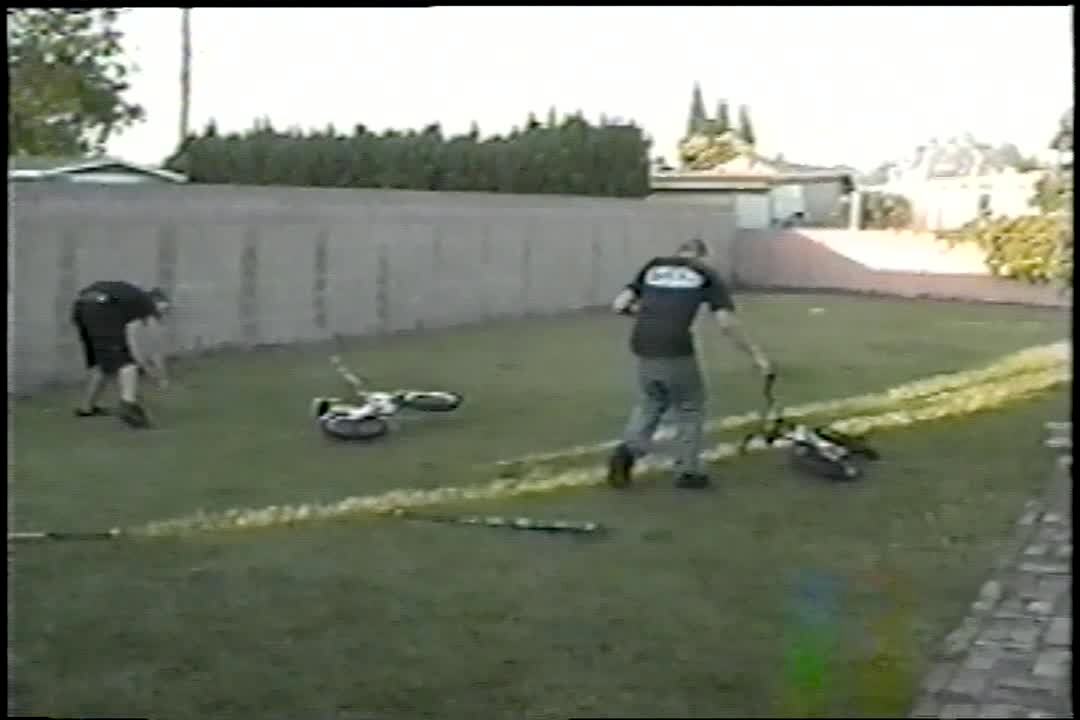 2 men spin on a bat, jump on bikes dizzy and one crashes into the fence.