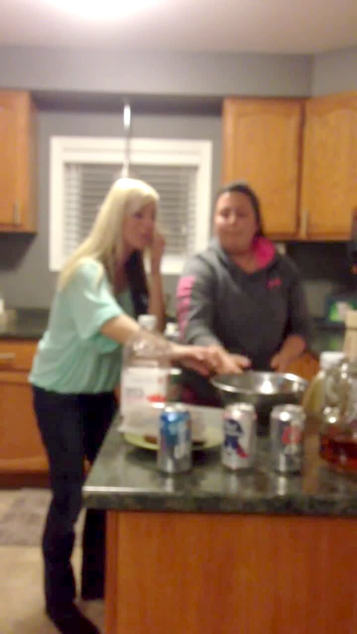 A woman uses a spatula to reach a box of chips on the top of a cabinet. The box fall down on the woman's face and she falls on the floor.