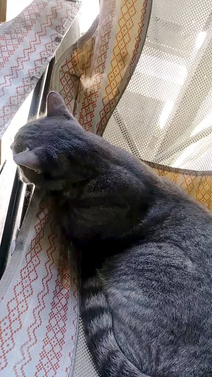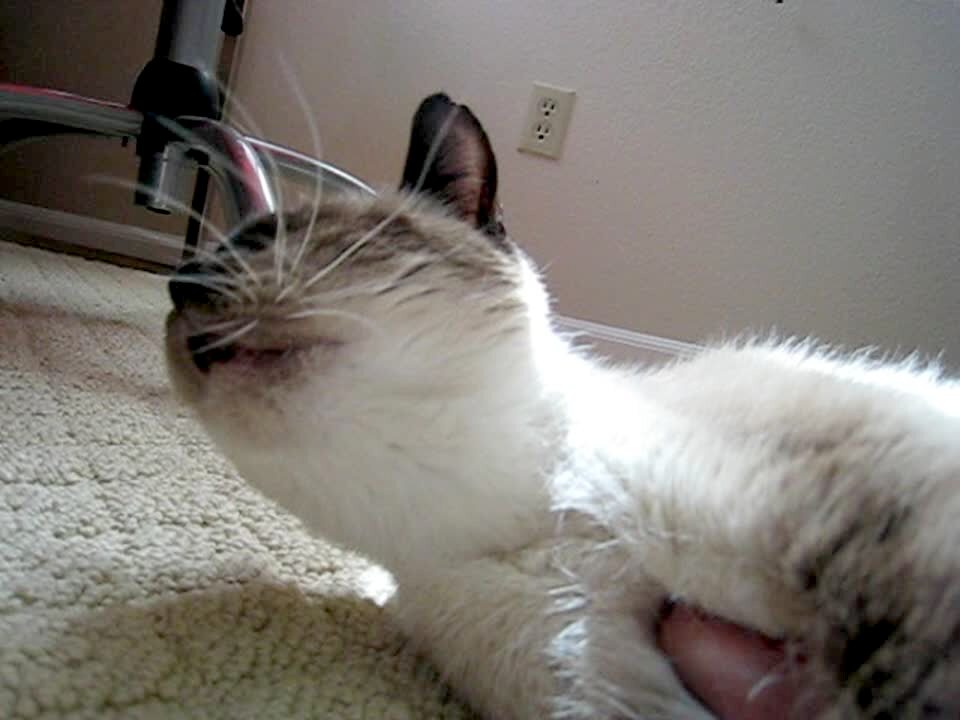 A one-eyed cat being scratched on the ground purrs, sounds like an owl / bird. Odd / weird.