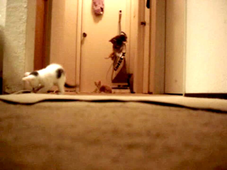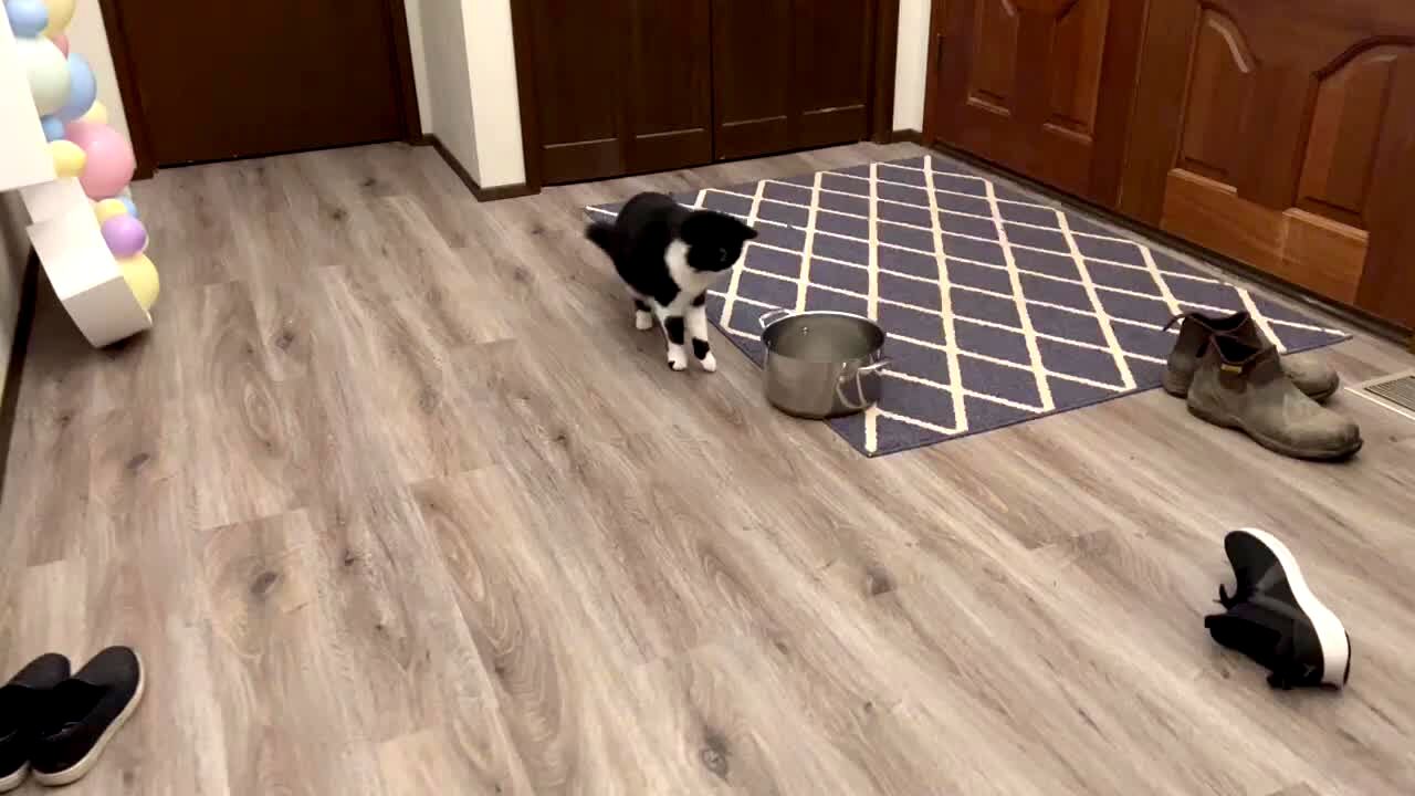 Several kittens crawl on vacuum in hall, scatter when vacuum is turned on. Cats.