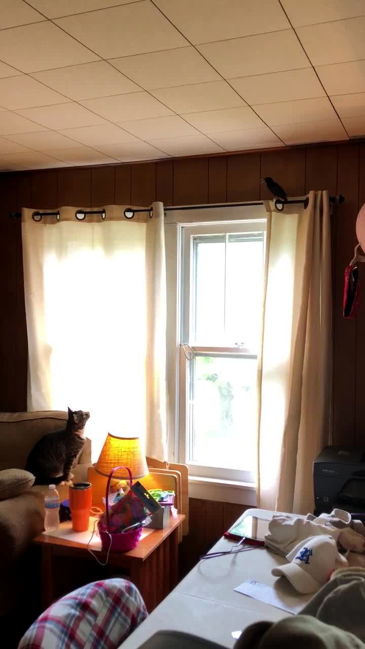 A cat flinches every time a roof leaks water into a metal pot on the floor of a living room.