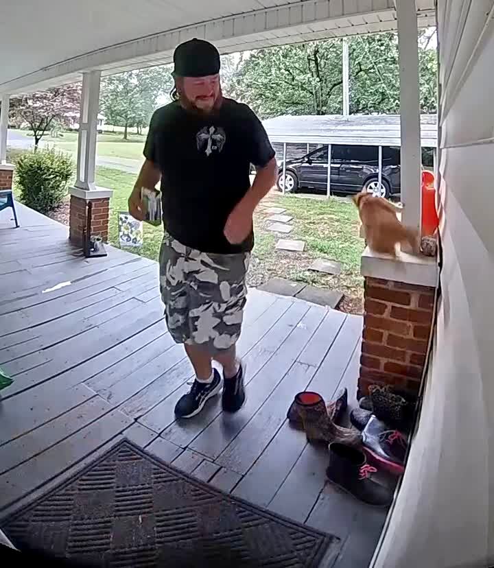 A cat stretched on a front porch when a man walks up onto the porch startles her causing her to jump onto and off of a nearby wall like parkour. Security footage.