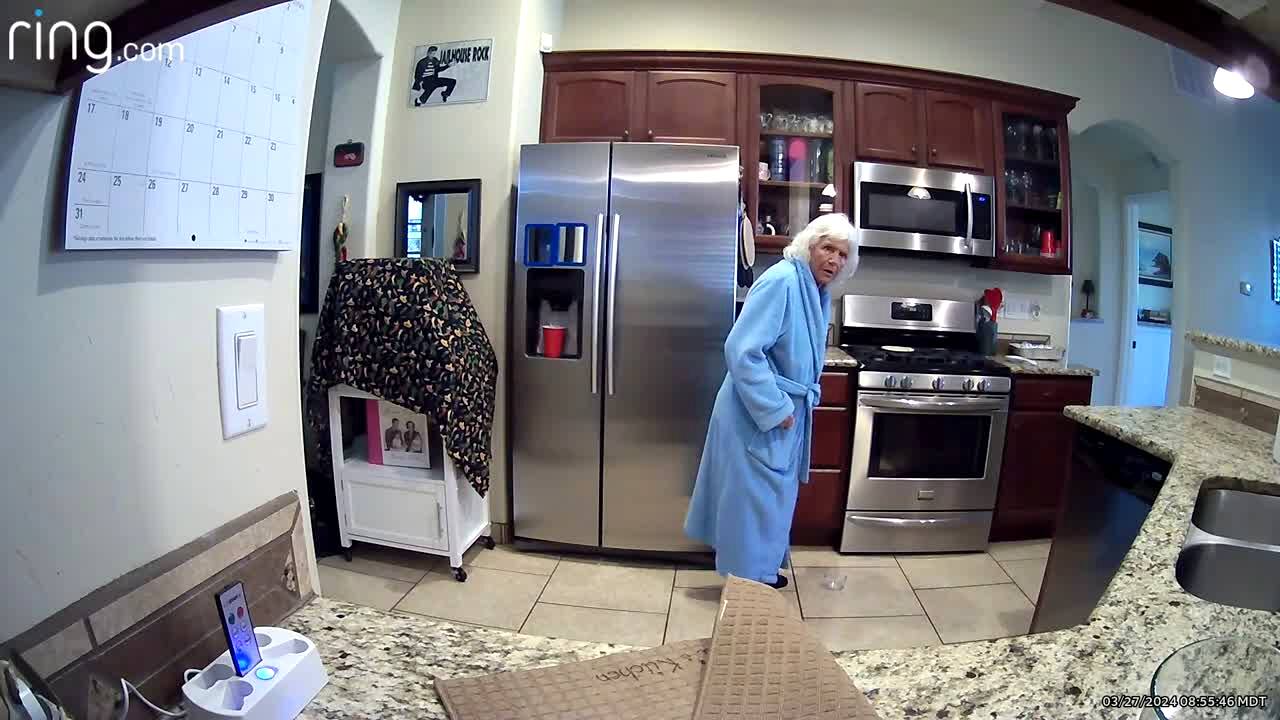A cat gets into kitchen cabinets and pulls out glass bowls. They crash onto the floor and a senior woman comes into kitchen confused about what happened.